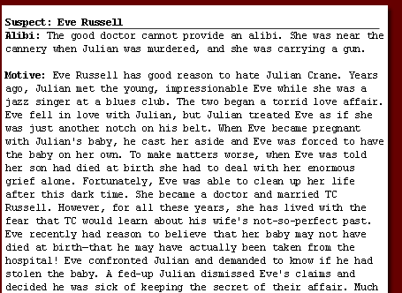THE SUSPECTS Antonio - Ethan - Eve - Ivy - Luis - Pilar - Rebecca - Sheridan - TC - Theresa
